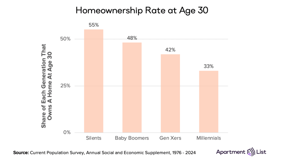 Less than 55% of Millennials own homes as of 2025, compared to 70%+ of Boomers at the same age. Progress has been slow due to affordability issues.
